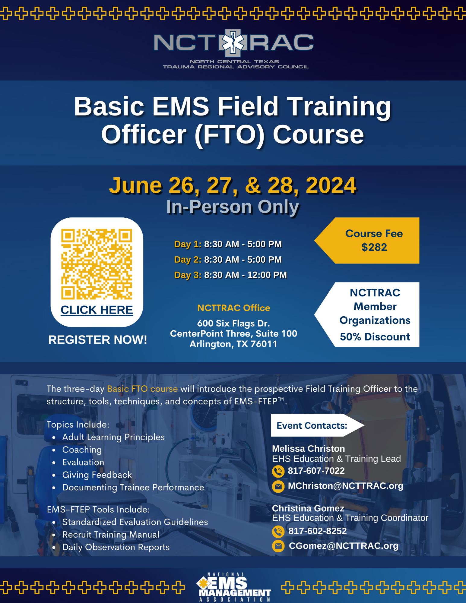 The three-day Basic FTO course will introduce the prospective FTO to the structure, tools, techniques, and concepts of EMS-FTEP™. It will provide instruction in adult learning principles, coaching, evaluation, giving feedback, and documenting trainee performance using EMS-FTEP™ tools. This includes Standardized Evaluation Guidelines, Recruit Training Manual, and Daily Observation Reports.