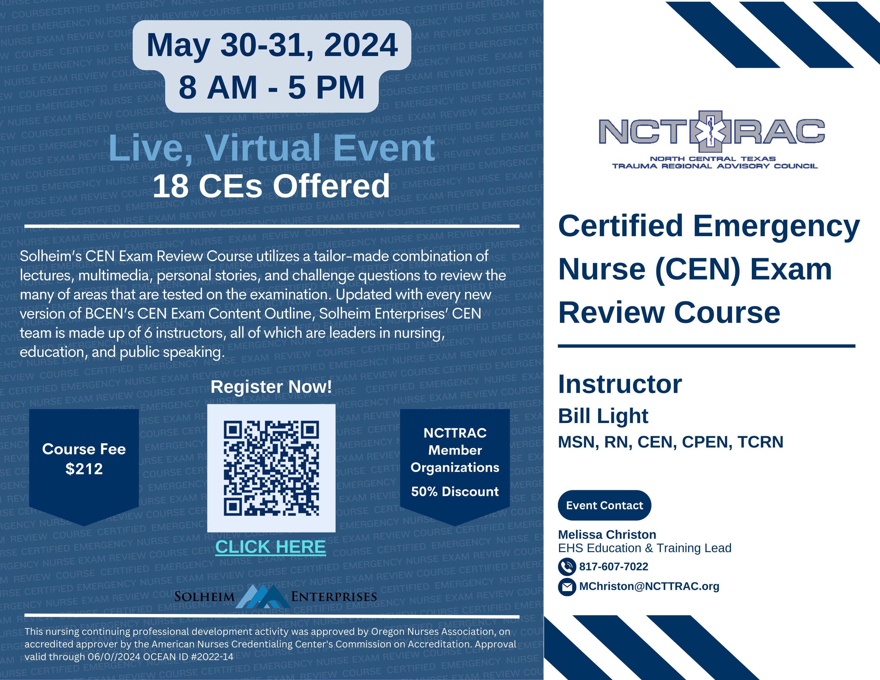 Solheim’s CEN Exam Review Course utilizes a tailor-made combination of lectures, multimedia, personal stories, and challenge questions to review the many of the areas that are tested on the examination.